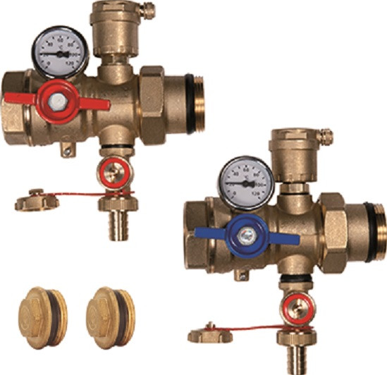 Set guľových ventilov pre prívod a spiatočku s vypustením, automatickým odvzdušnením a otvorom pre čidlo. Zostavu možno na