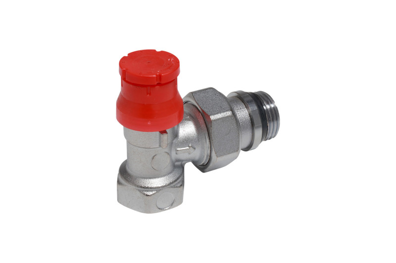 Termostatický ventil rohový, dvojregulačný s krytkou, chromovaný, s pripojením pre oceľové rúrky a so samotesniacim nátrubkom.