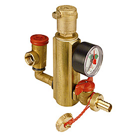 Skladá sa, R551E telo mosadzné, R88I automatický odvzdušňovací ventil, R140R pojistný ventil 3 bar, R225 manometer 0÷4bar, R608 vypúšťací guľový ventil