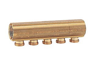Mosadzná rozdeľovacia tyč s vonkajšími vývodmi. Možnosť pripojenia na medené alebo plastové rúrky prostredníctvom adaptérov