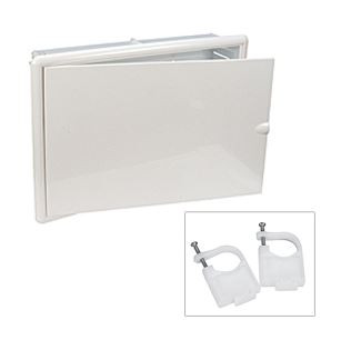 Plastová skrinka pre rozdeľovače R580C a R585C. Dvierka sa jednoducho otvárajú a zatvárajú vsadením do záražiek bez použitia