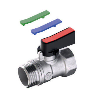 R690 Gužový ventil série MINI s vnútorným a vonkajím závitom. Povrchová úprava z chrómovanej mosadze. Plastová krátka páka s červenými, zelenými a modrými doskami (pouitie vody).