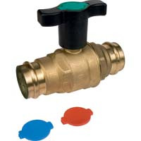 Plnoprietokový gužový ventil s lisovacími nátrubkami s čiernymi O-krúkami pre rozvody vody (sanita, kúrenie, chladenie). Ovládanie